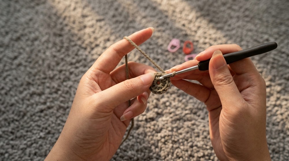 - Create a magic ring: Wrap yarn around fingers, insert hook into the loop, yarn over, and pull up a loop. Chain 1 to secure.