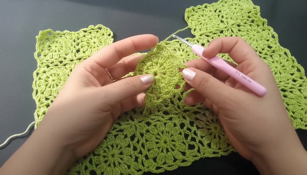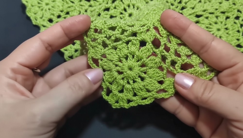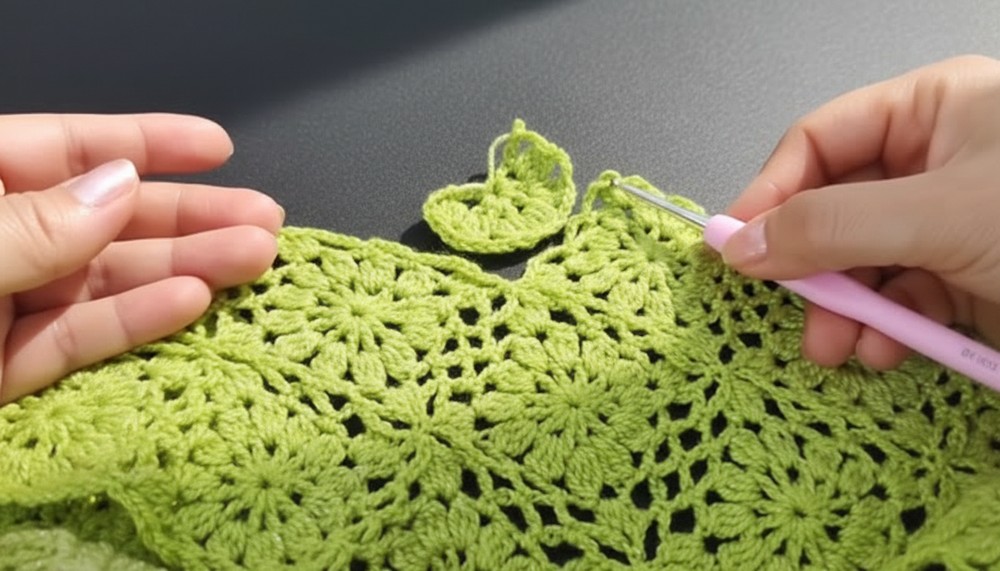 - Continue crocheting in a round, keeping 5 chains between each fan and maintaining fan stitch placement.