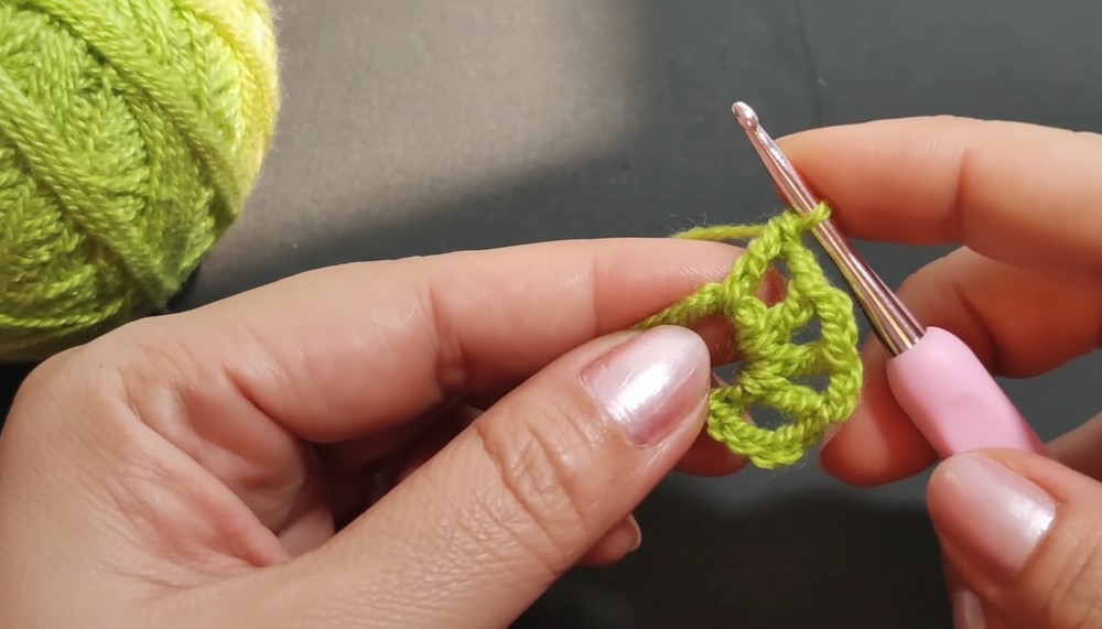 - Chain 3 (counts as first double crochet), make 2 double crochets (DC), chain 2, and make 3 DCs into the ring (forms a fan).