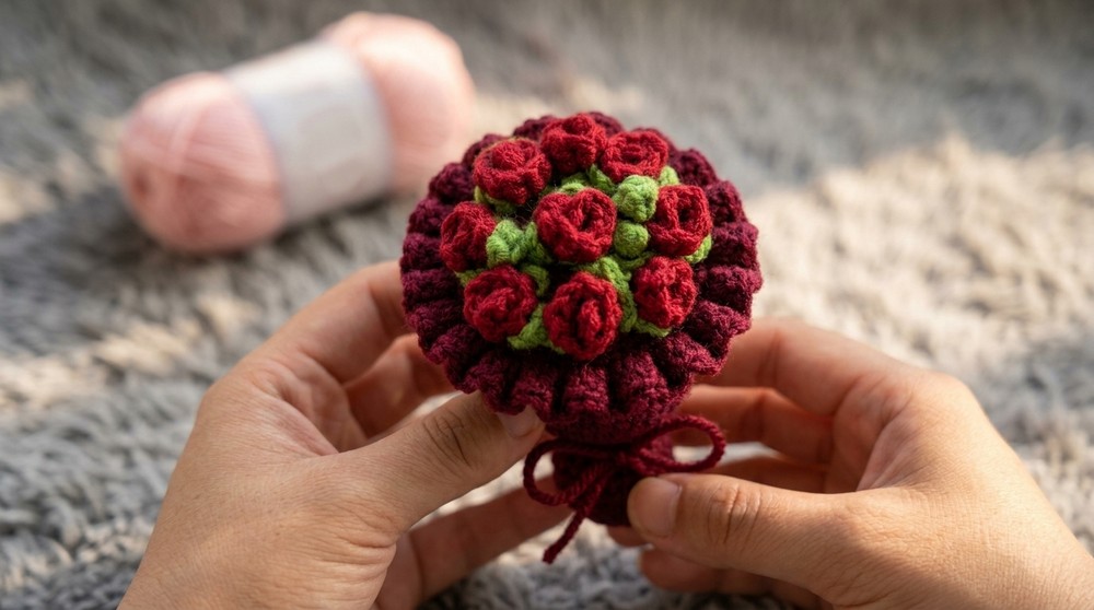 Imagine giving someone a unique handmade gift that feels special and full of love. This crochet Romantic Rose Gift helps you create a romantic flower bouquet with soft, colorful roses crafted entirely with yarn. The process begins with forming lovely round flowers and adding delicate green leaves to complete the design. The roses are carefully arranged in a charming bouquet, and the finishing touch is a small bow tied neatly around it, making it even more delightful.